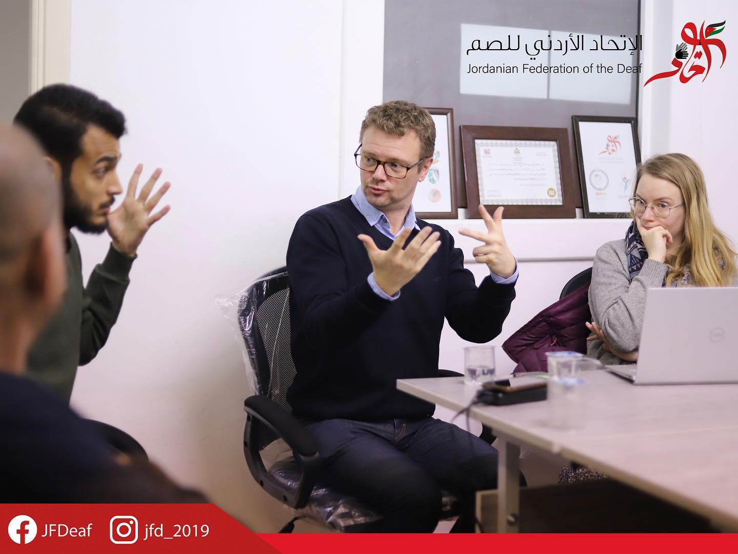 عقدت الهيئة الادارية للاتحاد الاردني للصم اجتماعا مع كل من السيد كاسبر والسيدة فيرا من الاتحاد الدنماركي للصم الجهة المانحة لمشروع يلا معا للامام حيث تمت مراجعة المرحلة السابقة للمشروع والتي مدتها ٦ اشهر حيث تم الوقوف على النقاط الايجابية والسلبية وتم مناقشة المرحلة المقبلة والتي مدتها ٦ اشهر حول اهم الاهداف والية التنفيذ
